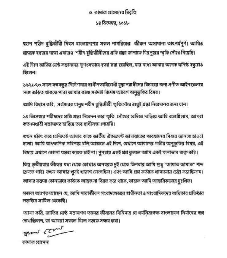 জামায়াত প্রশ্নে সাংবাদিকদের উপর ক্ষিপ্ত হওয়ার ঘটনায় দুঃখ প্রকাশ করেছেন গণফোরাম সভাপতি ড. কামাল হোসেন। শুক্রবার রাতে এক বিবৃতির মাধ্যমে তিনি বলেন, ‘বুদ্ধিজীবী স্মৃতিসৌধে গিয়েছিলাম শহীদদের শ্রদ্ধা জানাতে। ওই পরিস্থিতে একাধিকবার ঐক্যফ্রন্টে জামায়াতের সম্পৃক্ততা নিয়ে প্রশ্ন করায় খুব খারাপ লেগেছিল।’