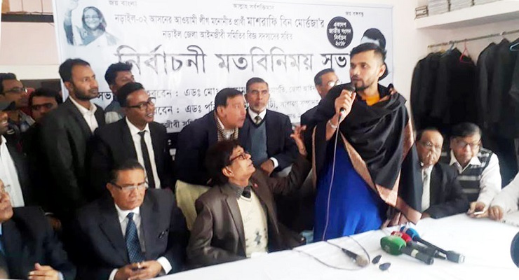 জেলা আইনজীবী সমিতি মিলনায়তনে আয়োজিত মতবিনিময় সভায় মাশরাফি বলেন, ‘নৌকা আমার প্রতীক; আপনারা সবাই নৌকা প্রতীকে ভোট দেবেন। আমিও আপনাদের সর্বোচ্চ সেবা দেয়ার চেষ্টা করবো। আমি আপনাদের সন্তান, আপনাদের মাঝেই বড় হয়েছি। আমার কোনো ভুলত্রুটি হলে আমাকে ক্ষমা করে দেবেন।’